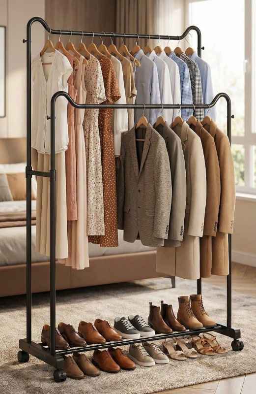 • حجم عائلي لتعليق كميات كبيرة من الملابس وتنظيم الأحذية. • طاقة التحمل 30 كيلو • مزود بأربع عجلات متحركة • يمكن استخدامه كحامل لتجفيف الملابس بعد الغسيل أو منظم للملابس والأحذية • مكون من منظمين ملابس ورف للأحذية
