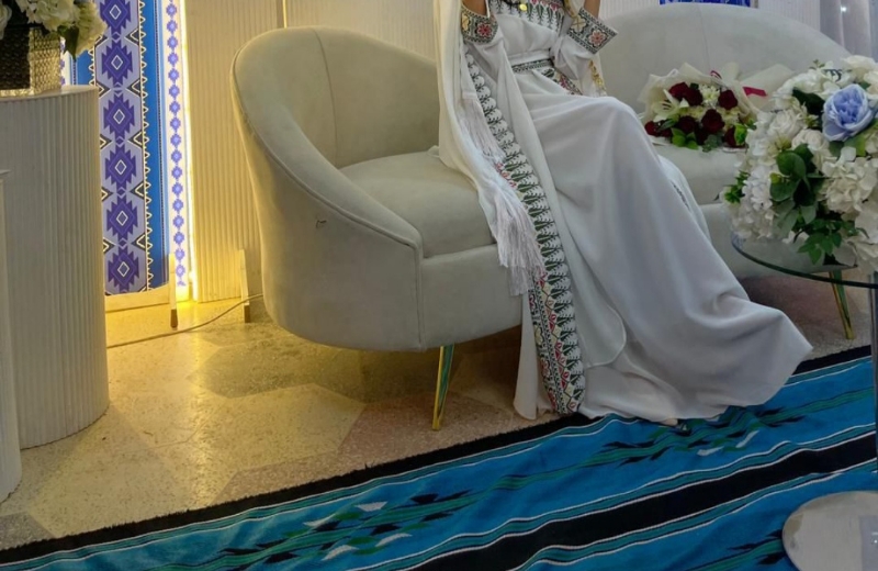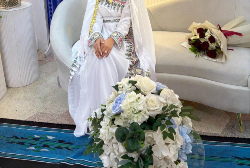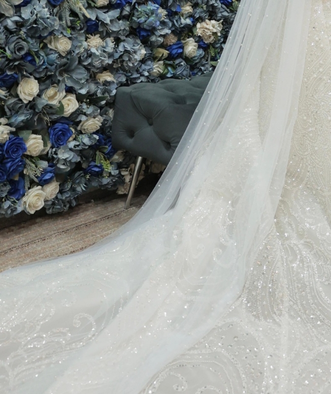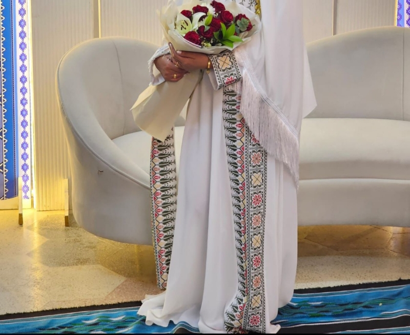 ثوب عروس ابيض مطرز بالاخضر مع طرحة خيوط وليرات
